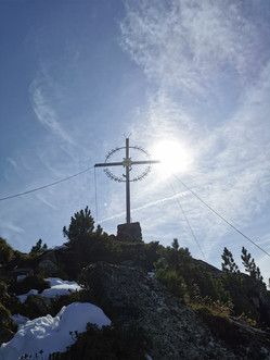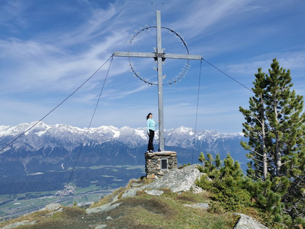 Nach eineinhalb Stunden ist man auch schon am Gipfel angelangt. Das Kreuz ist etwas vorgelagert, aber auch weiter hinten am Kamm hat man einen tollen Rundumblick: Von den Tuxer Alpen übers Inntal bis ins Karwendel. Einfach herrlich schön!